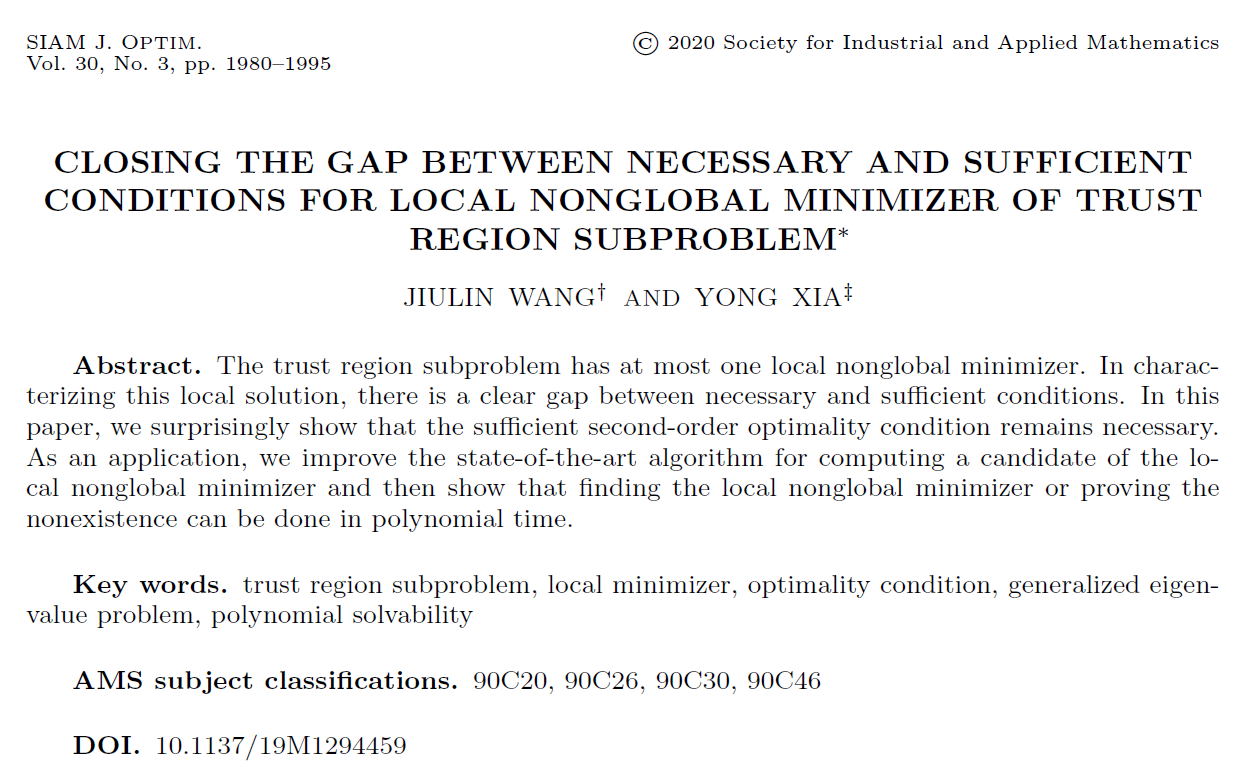 8858cc永利集团夏勇教授从2009年末接触该问题就被其所吸引并一直展开相关研究,2017级博士研究生王玖鳞从2015年做北航本科毕设起在夏勇教授指导下从事信赖域子问题的研究。2020年,他们取得了突破,首次建立了局部非全局解的充分必要的最优性条件,终结了信赖域子问题局部非全局解充分条件和必要条件之间存在了27年之久的这一间隙,首次证明局部非全局解亦可在多项式时间内可解,从而消除了信赖域子问题的Tao-An悖论。