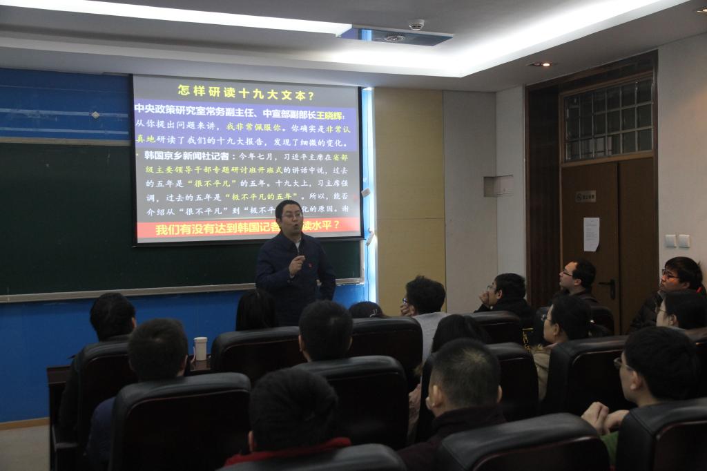 为深入学习宣传贯彻习近平新时代中国特色社会主义思想和党的十九大精神,11月28日下午,公司党委邀请了马克思主义学院高宁老师在主楼321做了题为“谈谈学习十九大精神的一点体会”的学习讲座。公司党委丁丁副书记、一百余位教师和员工党员聆听了讲座。