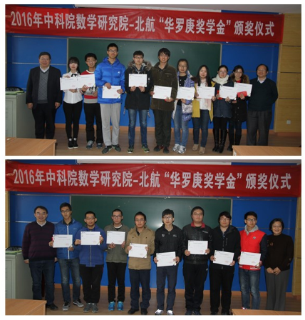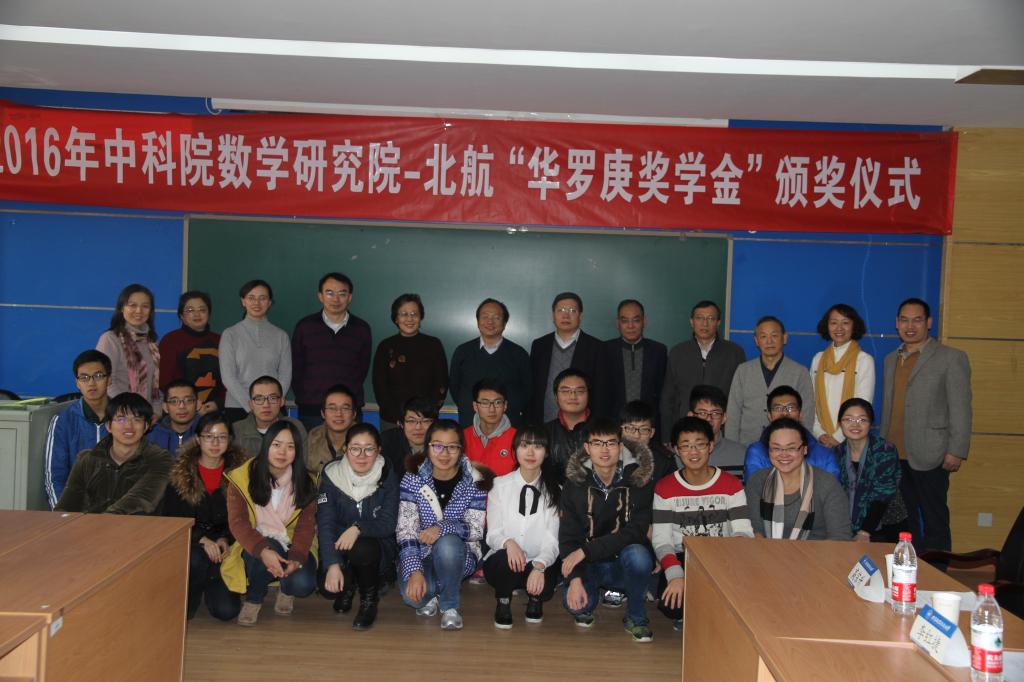 出席此次颁奖仪式的还有中科院研究生部的邵欣老师和刘霞老师,北航数学学院教学副经理杨义川教授、学院教师高宗升教授、漆毅教授和李红裔教授,北航数学学院机教师、辅导员,以及获奖的20名华班同学。自2015年起,中科院数学院与北航联合设立“华罗庚奖学金”,每年从华罗庚班评选出20名优秀学子,每人发放2000元奖金,本次获奖员工的名单如下:赵青,李冠巡,万艺君,王志超,冯亦葳,白瑞祺,杨睿劼,秦国林,苏啸宇,胡杰,沙铜,胡一飞,史庆祥,赵世帆,周郑晔,马骏宇,陈旭阳,陈昱蓉,方泓懿,孙禄 。