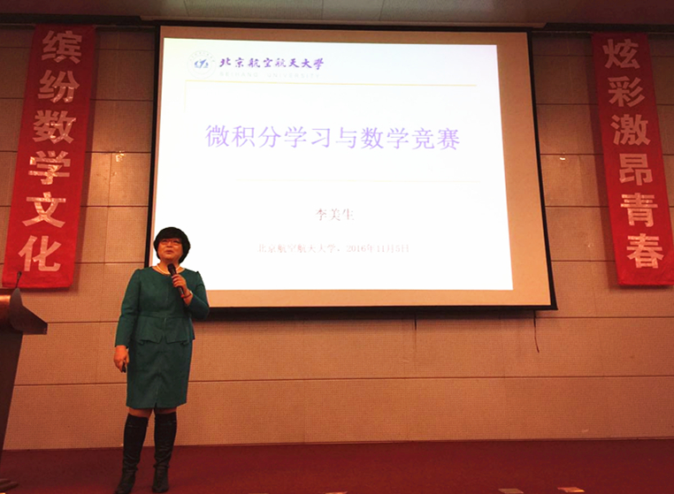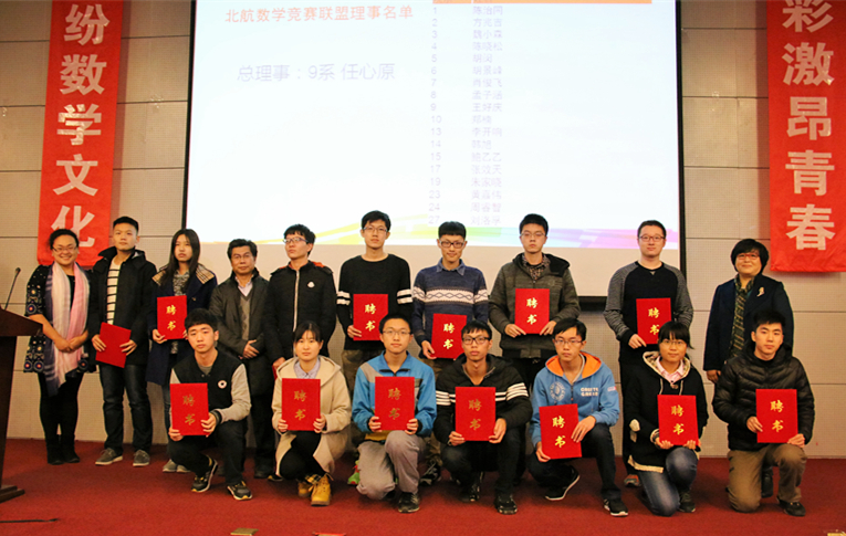 除了数学建模的学习与比赛,本届数学文化周将数学竞赛的主题也纳入其中。为了能让更多的同学们了解和参与数学竞赛,通过数学竞赛提升数学思维与数学素养,本次文化周期间,数学学院邀请了来自全校各个学院的数学竞赛高手,担任北航数学竞赛联盟理事,与数学学院一起形成数学竞赛从报名到培训、训练、参赛、交流的联盟,让更多的同学们走进数学、学习数学、享受数学。教务处副处长曹庆华、数学学院教师李美生为首届北航数学竞赛联盟理事颁发了聘书。接下来,教务处副处长曹庆华还特别向同学们全面介绍了北航丰富的竞赛平台及骄人成绩,鼓励同学们在北航努力学习,勇于尝试,展现潜力。
