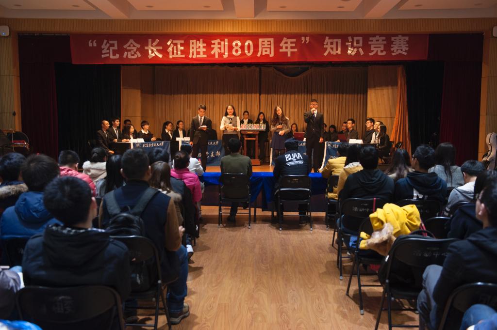 有什么样的精神,就有什么样的力量;有什么样的信仰,就有什么样的方向。一次次地从困境中绝地逢生,一次次地在危难中转危为安,当四支红色大军在80年前的那个十月胜利会师时,中国共产党所领导的这些红色战士,不仅谱就了长征这样伟大的史诗,而且铸就了无与伦比的精神丰碑。长征精神,历久弥新;长征之路,没有终点。在此弘扬长征精神的背景下,2016年11月5日,由北航数学学院Y16091党支部主办,以“纪念长征胜利80周年”为主题的知识竞赛在晨兴剧场顺利举行。参与活动的领导有数学学院辅导员林泽田、仪器光电学院辅导员张天航、高家欣和软件学院辅导员王玉世。此次活动由Y16091党支部、SY16171党支部、SY16172党支部和研究生1521党支部全体成员参与,各党支部分别派出代表队参加竞赛。