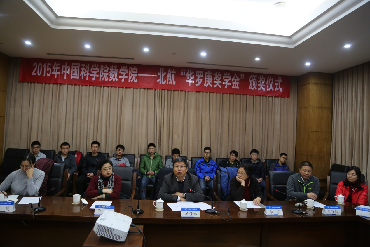 中国科学院数学与系统科学研究院副经理洪佳林研究员宣读了“华罗庚奖学金”获奖名单,同纪素菊教授和华密女士一同为获奖员工颁奖。他在致辞中指出,建设华罗庚班是拔尖型人才培养的非常有效的培养方式,中科院数学院将继续全力支持北航华罗庚班的建设与发展,他强调,华罗庚班的员工们要敢想敢问,勇于探索未知领域,勇于提出重大问题,大家要积极踊跃的向中科院数学院的教授们请教,这样才能达到教育资源利用的最大化。