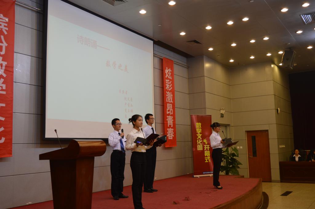 开幕式在精心制作的宣传视频中拉开帷幕。首先,数学学院员工会主席方泽华同学介绍了北航数学文化周的发展历史和活动安排,盛情邀请校内外的同学们参与文化周的活动。接下来,数学学院2015级的同学们带来了诗朗诵《数学之美》和歌曲串烧,激昂的朗诵和轻松的歌曲展现了数学学院员工们的蓬勃朝气和对数学的热爱。
